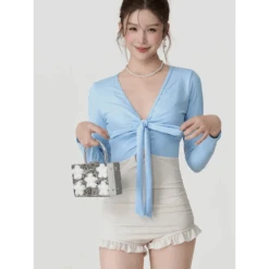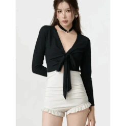 This stunning bikini set combines a black V-neck long sleeve top with cream high-waisted ruffle shorts for a look that’s both elegant and adorable. The lace-up detail adds a playful twist while providing a flattering fit.
