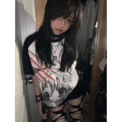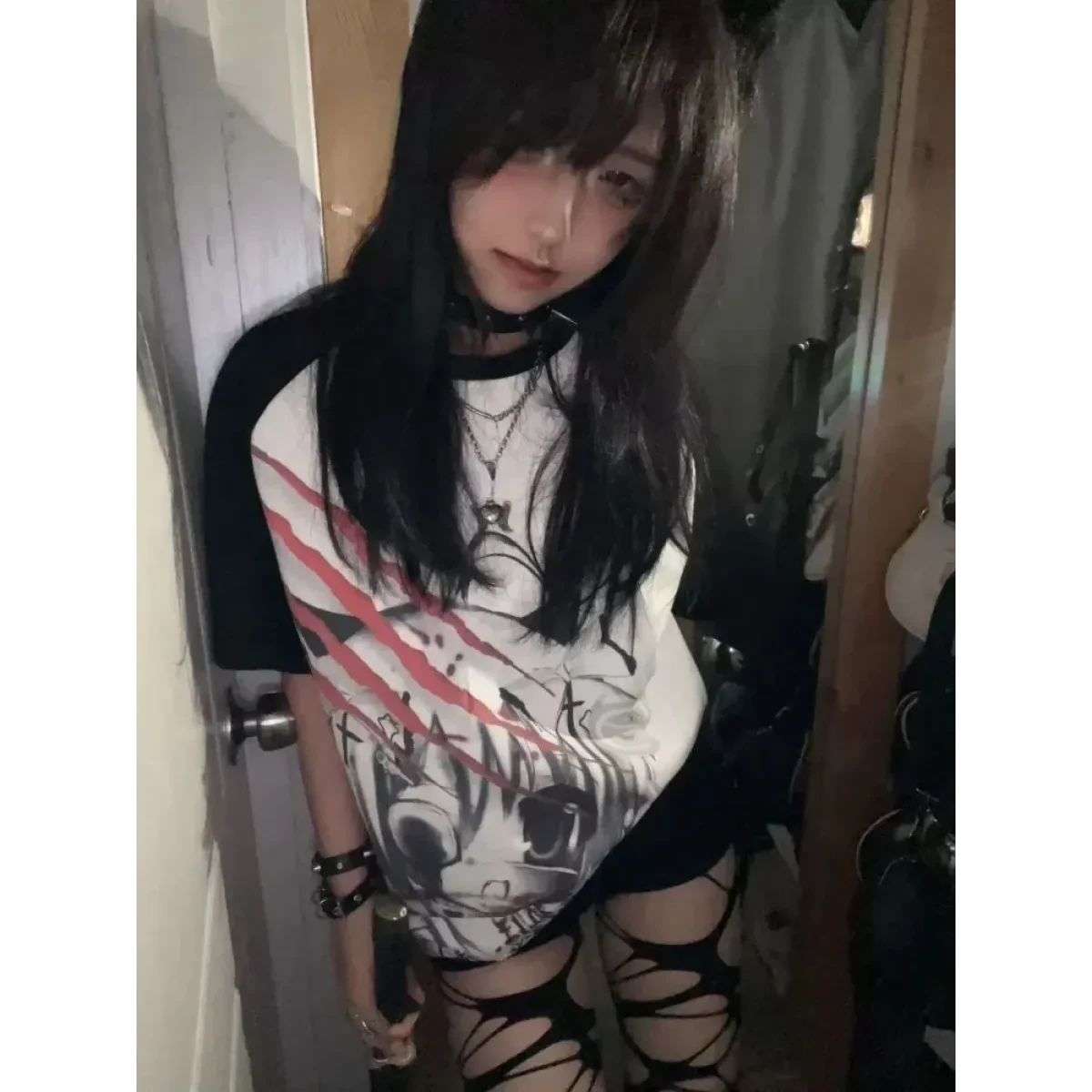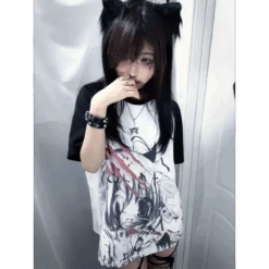 Channel your inner goth with this bold anime-inspired graphic tee, perfect for lovers of edgy Harajuku streetwear and Y2K aesthetics. With its striking black-and-white design and relaxed fit, this top is as versatile as it is stylish! 🌙