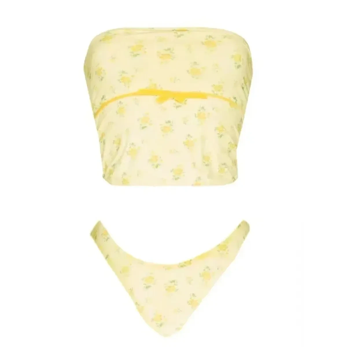 This dazzling bikini set channels serious Spice Girl vibes with its strapless bandeau top and bright yellow floral print. It’s a nostalgic nod to ’90s girl power, reimagined for your hottest summer ever!