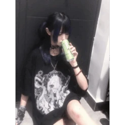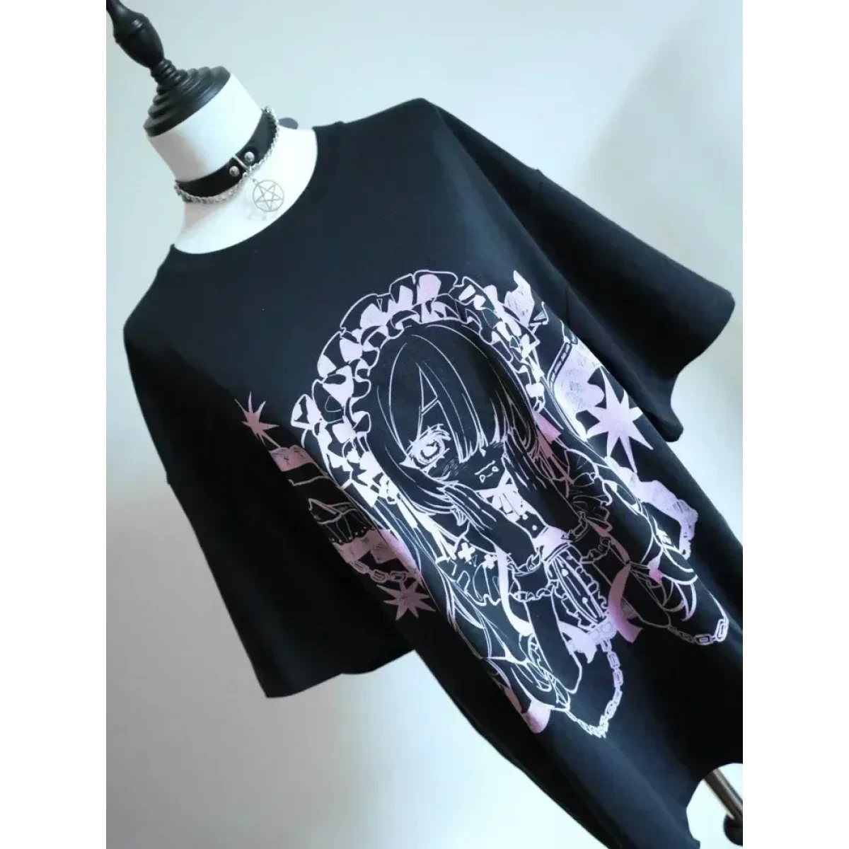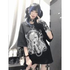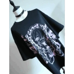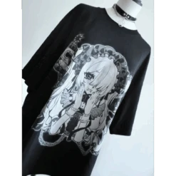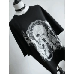This Harajuku Fairy Graphic T-Shirt fuses gothic charm with dreamy anime aesthetics. The bold black-and-white design showcases a mysterious manga-style girl in frills and chains, making it a must-have for fans of alt-Japanese fashion.