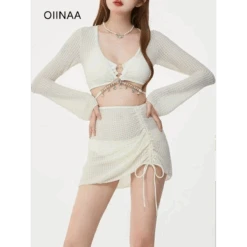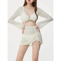 Float into summer with the Ivory Mesh Chain Bikini Set—a dreamy, coordinated swimwear trio featuring a long sleeve lace-up crop top, low waist bikini bottoms, and a ruched mesh mini skirt. With its soft ivory palette, delicate texture, and charming beaded chain detail, this set is made for seaside selfies and poolside posing.