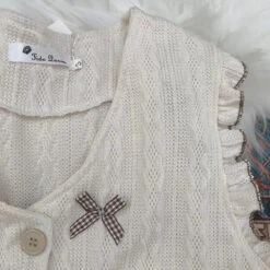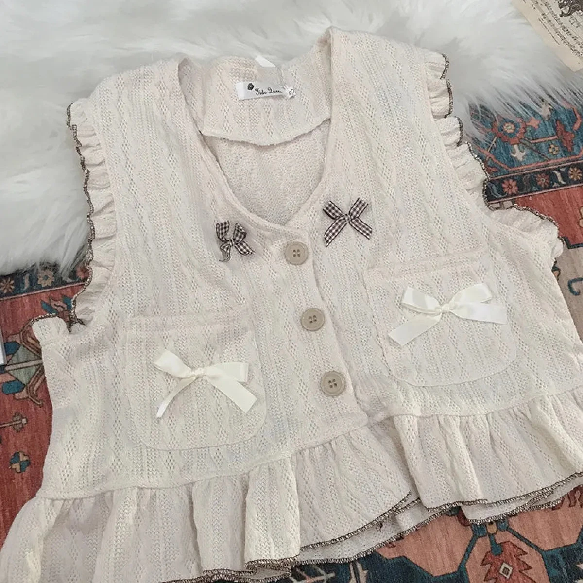 🌸 Introducing: Kawaii Lolita Ruffle Knit Sweater Vest – Elevate your style with a touch of sweetness! Embrace the charm of Japanese fashion with this adorable bow-adorned cardigan, perfect for adding a playful flair to any outfit.