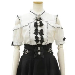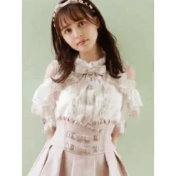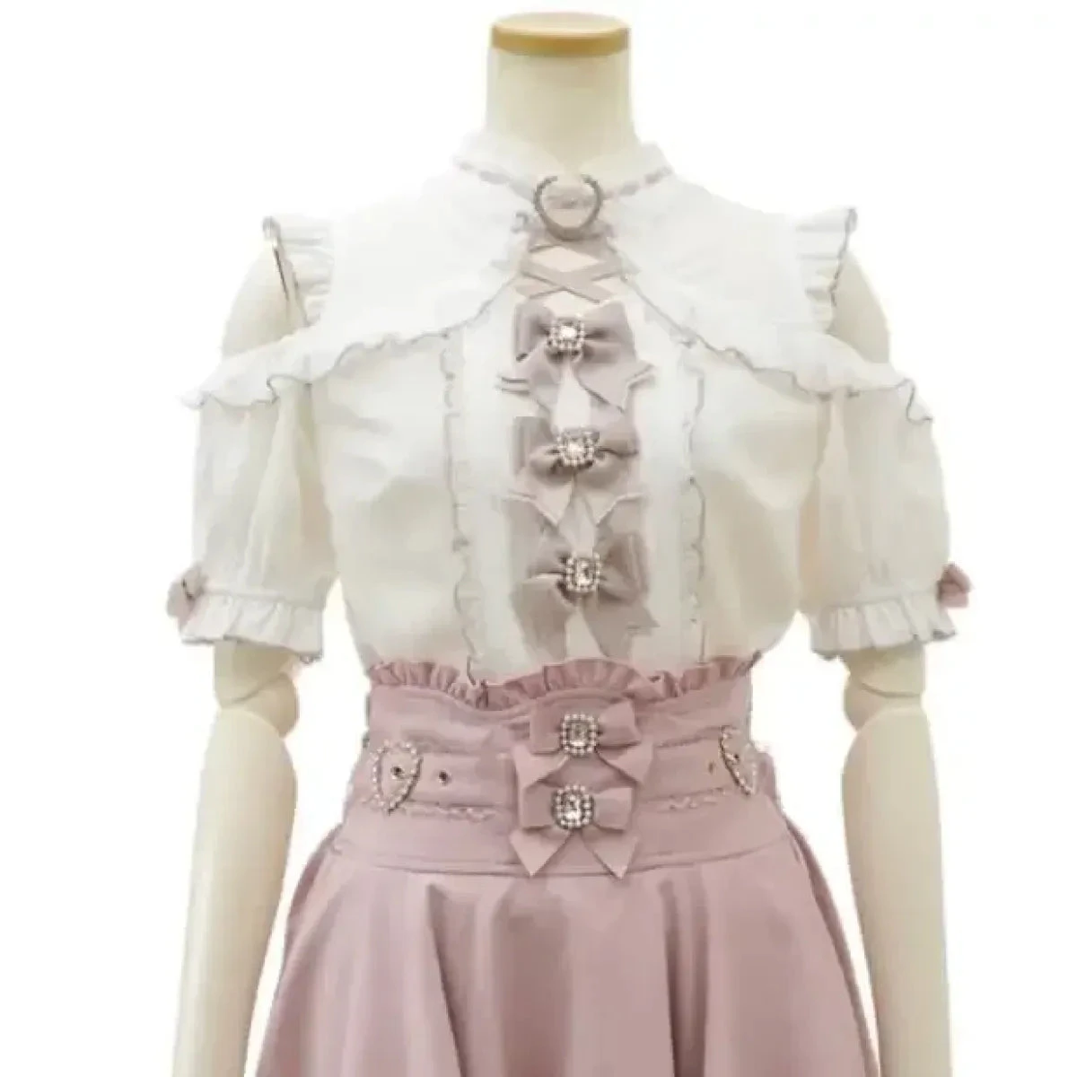 This delicate off-shoulder blouse blends aristocratic charm with kawaii elegance, thanks to its intricate lace, cascading black bows, and soft pastel fabric. It’s the perfect blend of dark romance and doll-like sweetness.