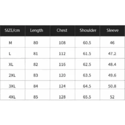 | Size | Length (cm/in) | Chest (cm/in) | Shoulder (cm/in) | Sleeve (cm/in) |