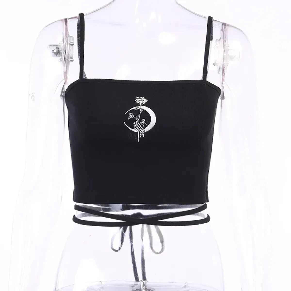 - Design: Gothic-inspired wrap crop top with a unique moonlit print for an eye-catching edge.