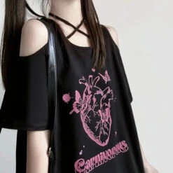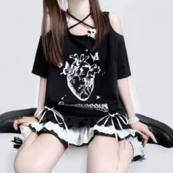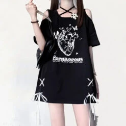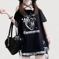 This Off Shoulder Bow T-Shirt is the ultimate mix of gothic grunge and kawaii rebellion. With bold pink lettering, a heart graphic, and lace-up ribbons on each side, it’s your go-to piece for standing out in any alt aesthetic lineup.