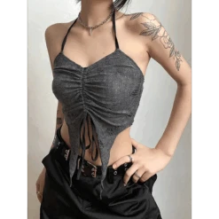 V-Neck Collar: The V-neck design adds a touch of feminine elegance to this edgy ensemble.