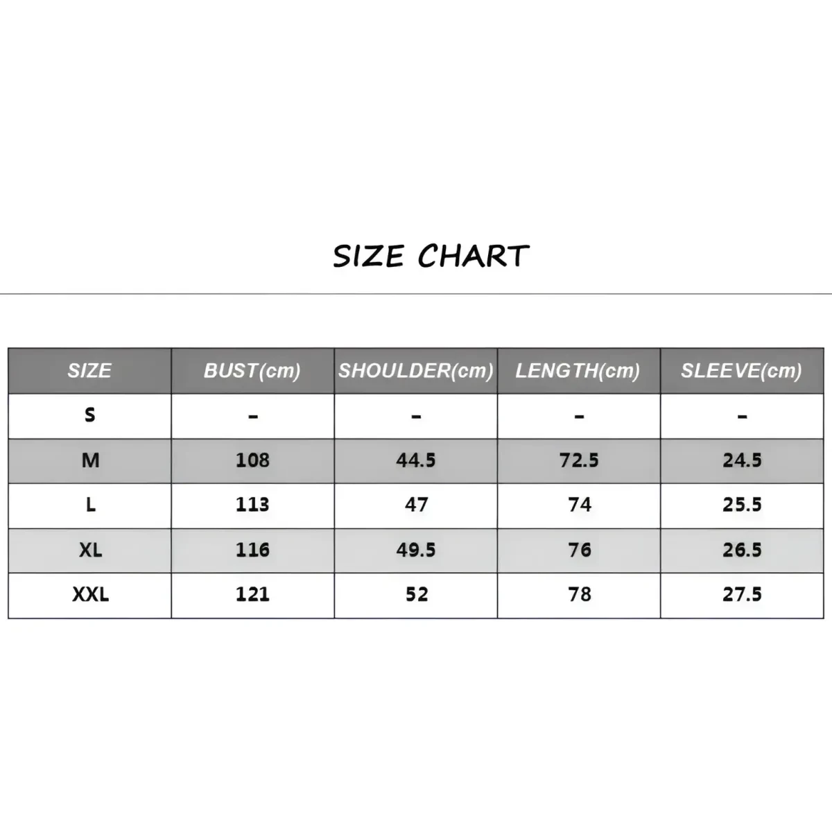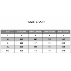 | Size | Bust (inches) | Shoulder (inches) | Length (inches) |