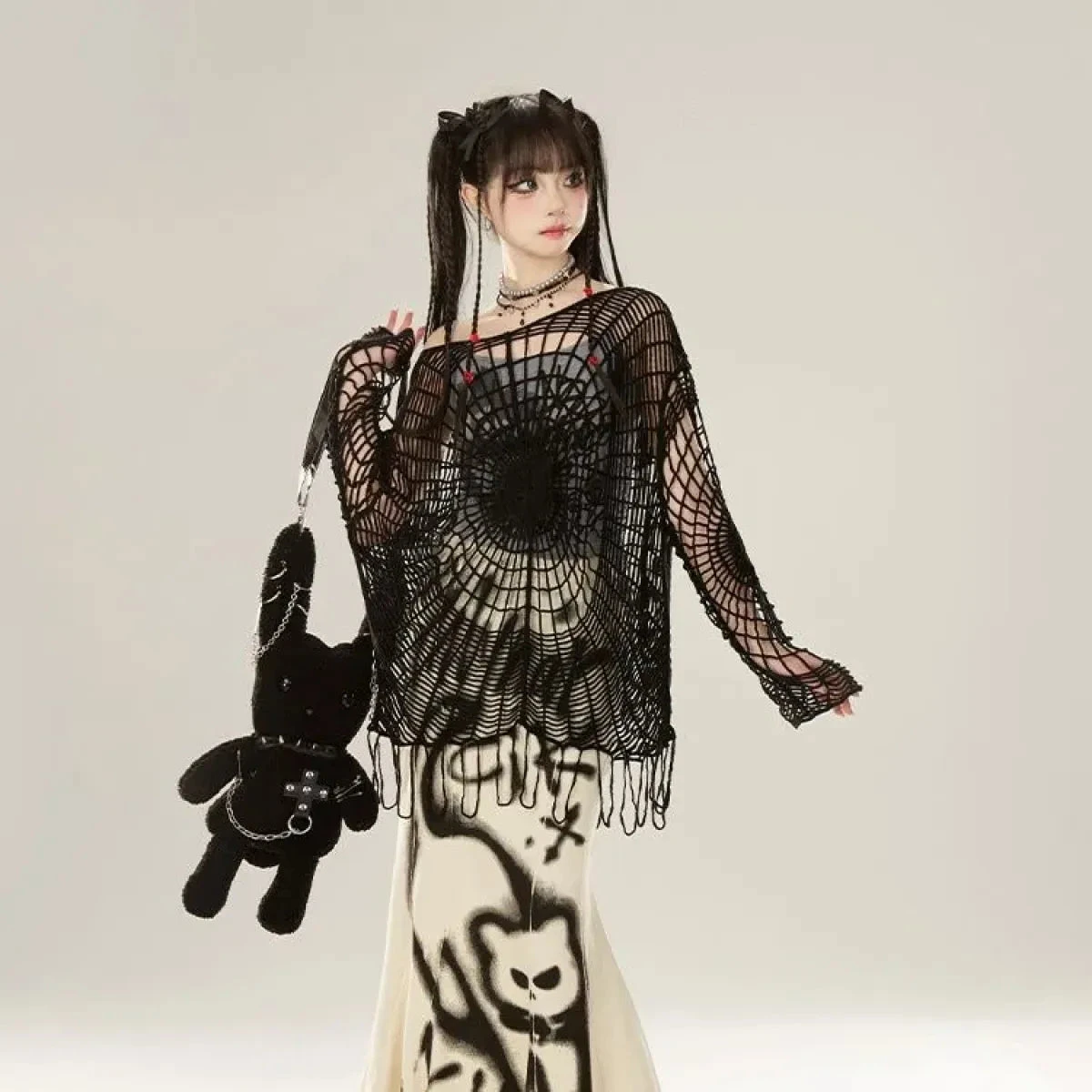 Step into your villain era with the Spider Web Knit Sweater – Y2K Off Shoulder Grunge Pullover, the ultimate mix of spooky-cute and cozy-cool. With its slashed neckline, edgy hollow-out web knit, and loose grunge fit, this sweater is made for babes who love their streetwear a little bit haunted. Whether you’re layering it over a strappy tank or letting it drape off one shoulder, this pullover spins serious style magic 🕸️