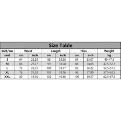 | Size | Waist (cm) | Length (cm) | Hips (cm) | Weight (kg) |