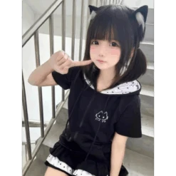 Add a splash of Harajuku charm to your wardrobe with this Y2K-inspired kawaii cat T-shirt. Featuring playful patchwork accents, this soft girl top combines nostalgic Y2K aesthetics with a modern twist. Made from lightweight polyester, it offers a comfortable fit for sunny summer days. The hooded collar and solid pattern provide a unique design that’s both trendy and versatile.