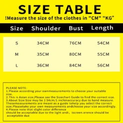 | Size | Shoulder (cm) | Bust (cm) | Length (cm) |